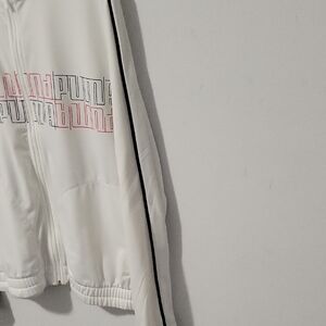 Stylish white track jacket featuring a pink Puma logo. Perfect for casual wear.