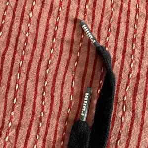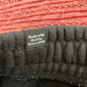 Fair condition due to two spots on the upper backside that have what appears to be sap or some other hardened substance does not affect comfort or use. They also have some pilling and are slightly faded . I’ve not tried to remove this.. there is no fabric label however it feels like a thick cotton or cotton blend. The material is very soft on the inside and has two lovely front pockets and the elasticized waistband and drawstrings. Top quality brand and fabrication.