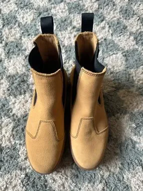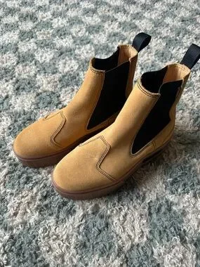 Chunky Chelsea boot in wheat suede. Black elastic side panels and pull tabs. Thick rubber lug sole with Puma branding. Modern platform silhouette.