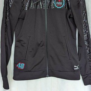 Puma sine 48 with leopard print detailing jacket. It is in excellent used condition. This jacket is AWESOME! It is such a unique piece. The jacket is XS and black in colour with hot pink and a neon like blue colours in the "48"patches. Such a rare find! It doesn't fit particularly small, given that is tagged as an extra small. I can't find anything like this jacket on the web!