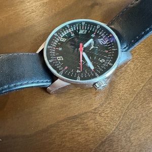 Stainless steal. Black leather strap. Water resistant. Battery required.
