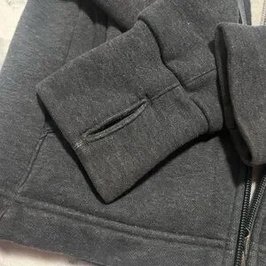Sweater style neck with thumb holes and pockets. Soft sweatshirts material; zip up. Perfect condition.