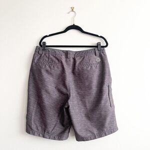 Puma Sport Style Shorts Flat Front Gray Black Hybrid Men's Size 36. Two front slash pockets. Two back pockets, and a side pocket with zipper. Good used condition-there are a couple snags-see photos. There is no fabric tag, but I think theses could easily be worn as casual shorts, or board shorts for swimming. Please see photos for approximate measurements.