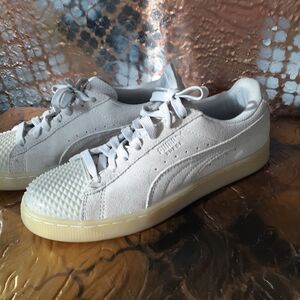 gorgeous pale grey genuine suede Sneakers from Puma. only worn once or twice. excellent condition, only minimal wear on soles, otherwise near perfect condition. size women's 7, fits true to size. unique studded toe detailing. rubber sole. doesnt come with original box.