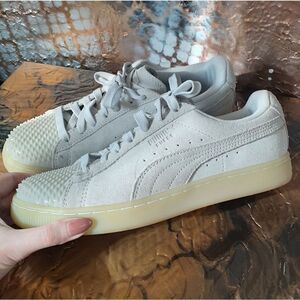 gorgeous pale grey genuine suede Sneakers from Puma. only worn once or twice. excellent condition, only minimal wear on soles, otherwise near perfect condition. size women's 7, fits true to size. unique studded toe detailing. rubber sole. doesnt come with original box.