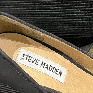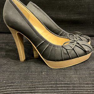 Over 4inch heeled pumps by Steve Madden. Small platform. Cute bow and pleats on black fabric. I'd say smaller than true to size because of the delicate toe box. If there are any measurements that would help, please let me know. Bought for a party I didn't attend so as new. Have lived in the closet in their box ever since. Bright lighting makes them appear lighter but they are black fabric.