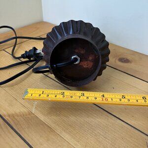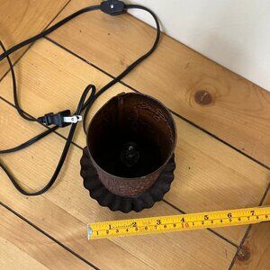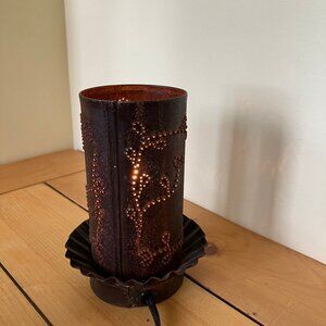 Vintage punched tin lamp has scroll design with "Faith Hope Love" on the front. Casts pretty diffused light when on. Cord has on/off switch. Uses one nightlight or chandelier bulb. Approx. 5 3/4" tall x 3 3/4" across widest part. Cord is approx. 55" long. Pre-owned condition: metal surface is rusted from age.