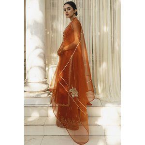 Experience elegance with our beautiful Rust Punjabi Pakistani outfit. This three-piece set includes a Shirt, Sharara, and Dupatta, all made from high-quality Silk. Skilled artisans handcraft each piece to ensure exceptional quality, setting them apart from machine-made items. Please note that our prices are fixed to emphasize our dedication to providing high-quality handmade products. (Note: The Kameez is full sleeve.) Note: These are brand new, never worn.
