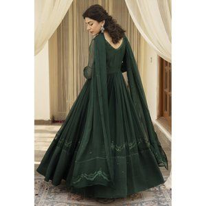 Elevate your style with our beautiful Green Anarkali Kali Daar. This three-piece set is made from high-quality chiffon and crafted by skilled artisans, ensuring top-notch quality in every detail. These handmade items stand out in contrast to machine-made products.