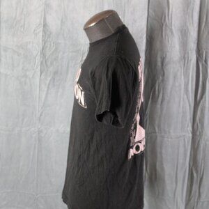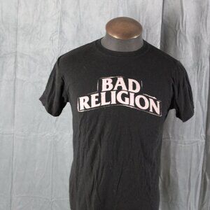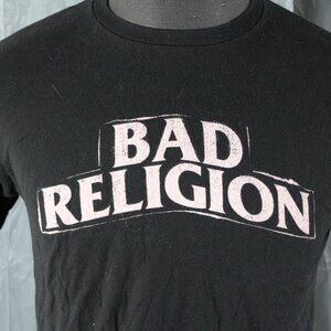 Up for sale is a punk band shirt. It has a black base colour with Bad Religion screened across the chest in white. The back of the shirt has the Bad Religion anti-cross logo screened on with the tour dates on either side of the graphic. What a great shirt do not miss out on it.