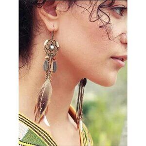 Punk Vintage Long Tassel Feather & Beads Drop Earrings - Wolf Tooth Pendant