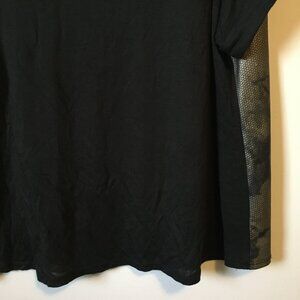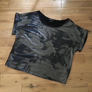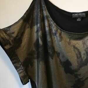 Very good preowned condition, feels like new, rolled sleeve tee featuring a sparkly almost sequin studded, but more of a print pattern in goldish and metallic tones by Forever 21+. Gives a tie-dye illusion. Back is solid black and a rayon material for comfort and breathability. Perfect attire for a rock concert or just lounging around indoors.