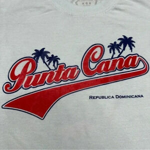 White, red, and blue in colour with Punta Cana logo on the front featuring palm trees.