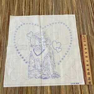 Pre-printed fabric panel has a puppy dog design and can be used for hand embroidery or liquid embroidery. Approx. 17"x17", can be used for quilt blocks, cushion cover, wall hanging, etc...