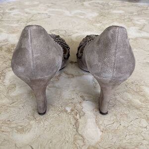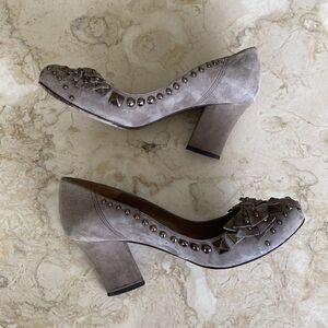In very good preowned condition gorgeous Pura Lopez suede leather pumps featuring eye catching studded details, bow and stylized 3” block heel.