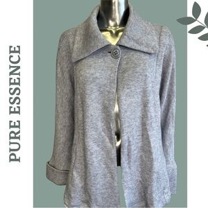 Pure Essence knit jacket with side front pockets, single button closure and collar. Super soft and cozy
