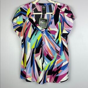 Pure Essence Urbanology Inc. Puff Sleeve Multicoloured Graphic Blouse Size Large