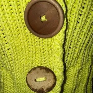 Size XS/S. The sweater is in excellent condition. The top button has been replaced and 2 other buttons have wear. It is handmade. It’s cotton. There isn’t any stains or holes.