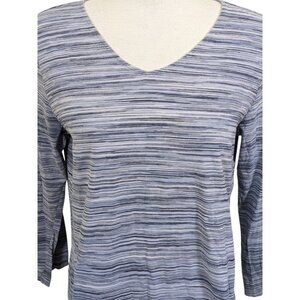 Elevate your wardrobe with this stylish Pure Jill Pullover Shirt Top in size Large. The gray striped pattern adds a touch of sophistication to this versatile T-Shirt. Perfect for any occasion, whether it's a casual day out, a business meeting, or a travel adventure. The V-neckline and long sleeves provide a comfortable and flattering fit for any body type. Crafted from 100% Cotton Knit fabric, this shirt top is machine washable for easy care. The pullover closure ensures a secure and comfortable fit. This regular fit T-Shirt is perfect for any season, whether it's winter, fall, or spring.