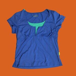 This Pure Lime short sleeve athletic top is where function meets flair. The vibrant royal blue base with contrasting green inner panel adds a sporty yet stylish edge. Features a deep V-neck with mesh-look inset, gathered bustline, and stretch-fit design that moves with you whether you're at yoga, running errands, or on a hike.