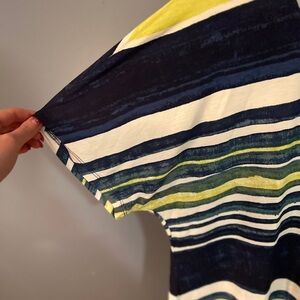 Elevate your wardrobe with this stylish striped top. Featuring a blend of navy and green, it's perfect for any casual outing.