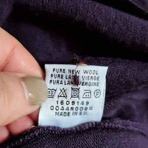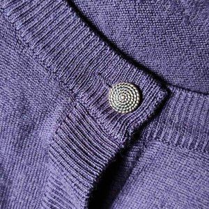 Beautiful deep dark purple color with gold tone buttons (one spare included). The wool is of a merino type, light, thin, elegant and warm. Very nice timeless item, will make a beautiful gift.