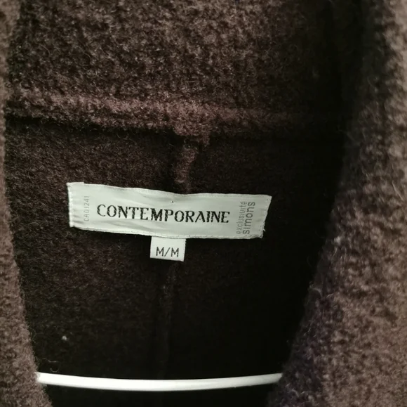 100 percent wool, excellent condition. Pockets. Not lined. Brown with purple hue.