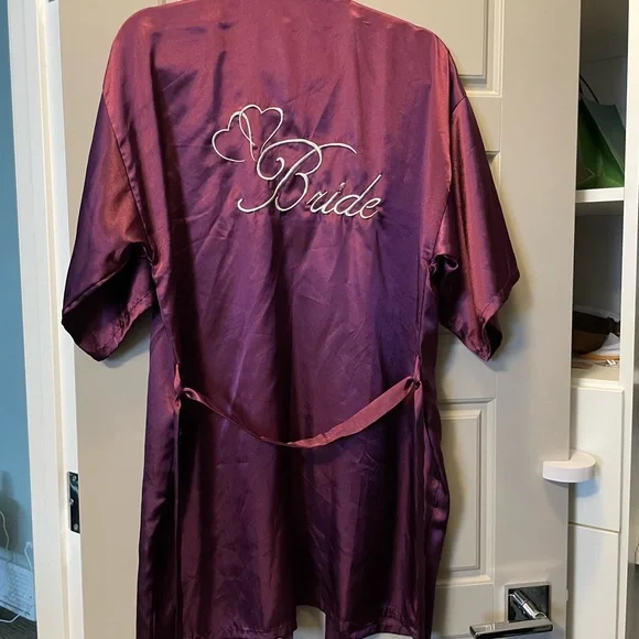Elegant purple satin robe with 'Bride' embroidery. Perfect for while getting ready for your big day or during your bachelorette party and wedding shower.
