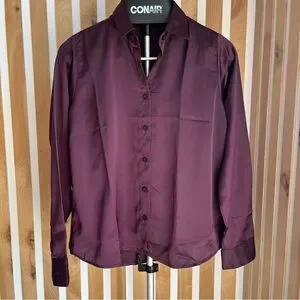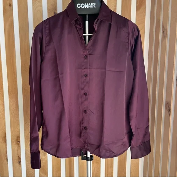 Stylish purple button-up shirt with a sleek design. Moves like silk, feels cool to touch, has a dual tone thi bf going on (see video). 100% Polyester.
