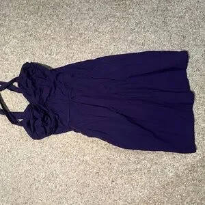 Dark purple dress. Criss-cross straps in the back and ruching on the cups.