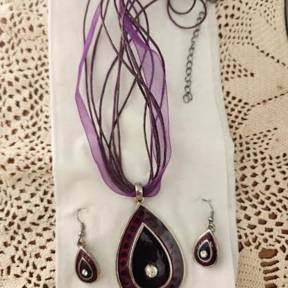 Beautiful tear drop shape purply Pendant with Ribbon as a Chain. with matching Earrings