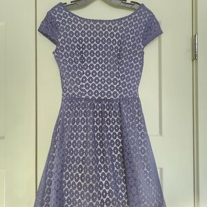 Size 1-2, Elegant navy blue/purple lace dress with a fitted bodice and flared skirt. Perfect for special or semi formal occasions.
