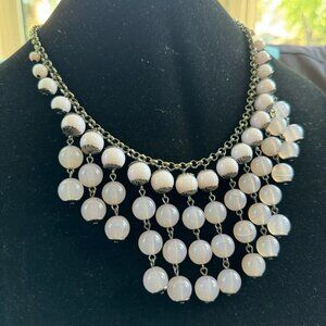 Unique pale lilac colored opaque and translucent plastic and glass beaded bib necklace with gunmetal chain