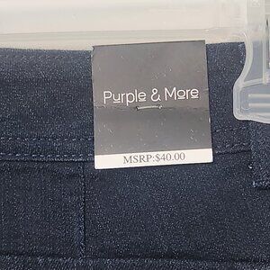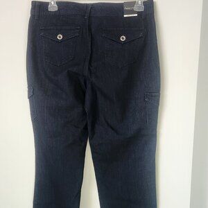 Dark blue stretch denim jeans NWT, ladies size 16. Front zip fly with button closure. Front slash pockets. Back pockets have buttoned flaps. Pocket on side of each leg has a snap closure flap. Inseam 31 inches. Legs approximately 27 inches at the crotch, tapering to 17 inches at the hem. Non-smoking home, no pets.