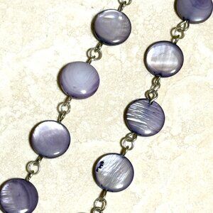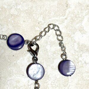 12 mm purple mother-of-pearl coin shell beads, 20 mm silver color "Slim Cat" pendant