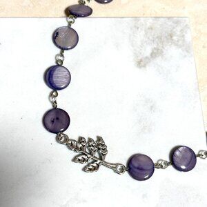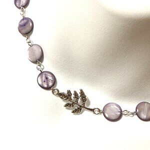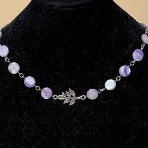 Purple Mother of Pearl Beaded Short Necklace + Silver Leaf Branch Pendant