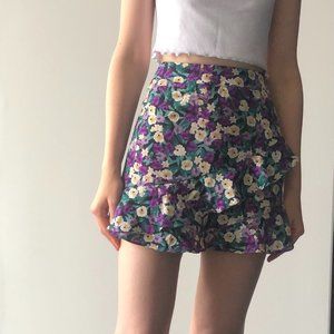 Lightweight woven fabric, with a lovely purple, green, beige, and white floral print throughout, creates swingy little shorts with a high banded waist and a ruffled skort panel at front. Hidden side zipper/clasp.