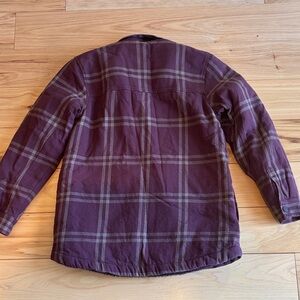 Stylish purple plaid button-up jacket. Perfect for layering.