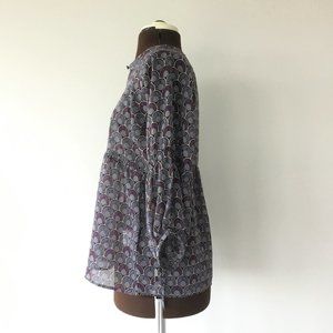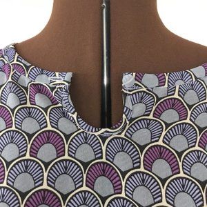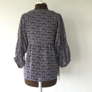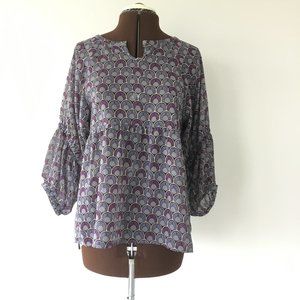 Purple print empire waist pullover top with U cutout neckline, 3/4 length sleeves that are gathered at elbow with ties.
