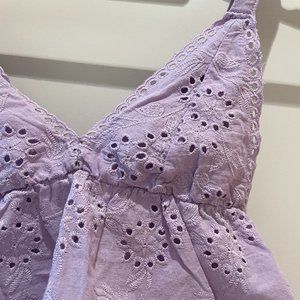Super cute summery purple tank top with subtle floral cut-outs. 100% cotton. Size XS.