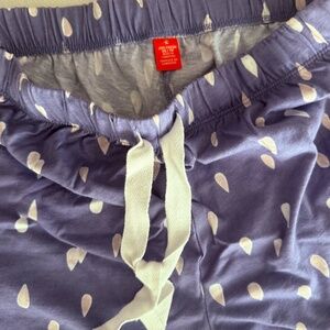 Purple lounge pants from Joe Fresh, size XS, featuring an all-over raindrop print in soft white. Made from a lightweight, soft fabric that feels comfortable and breathable. Designed with an elastic waistband and drawstring tie for an easy, adjustable fit, and finished with a relaxed, straight-leg silhouette. Cozy yet lightweight—perfect for lounging at home, sleeping, or casual everyday wear.