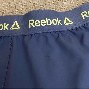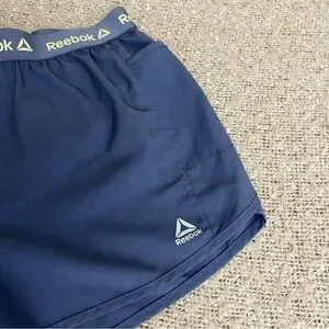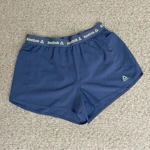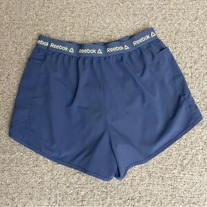 Purple Reebok athletic shorts in great used condition. Has one minor mark near the back waistband which is hard to notice (pictured). Comfortable and lightweight material, great for running or sports. Fairly short, high-rise fit. Features 2 pockets and inside lining. Size large with measurements pictured.