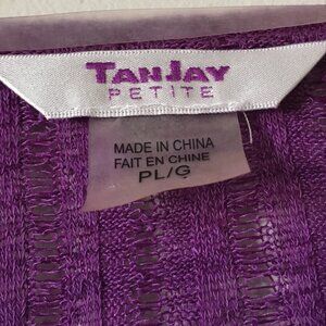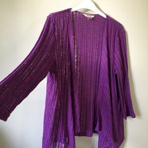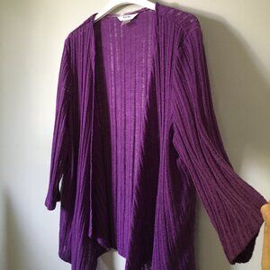 Very good preowned vintage condition, 3/4 sleeve, lightweight, ribbed mesh knit, open waterfall cardigan in bright purple by TanJay. So cute and happy. Interesting knit pattern.