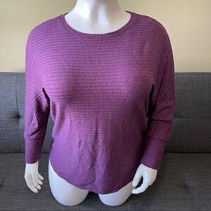Bright rich purple colour with a ribbed texture and very soft material. This sweater features dolman sleeves, crew neckline, and relaxed fit. Excellent used condition.