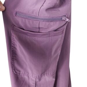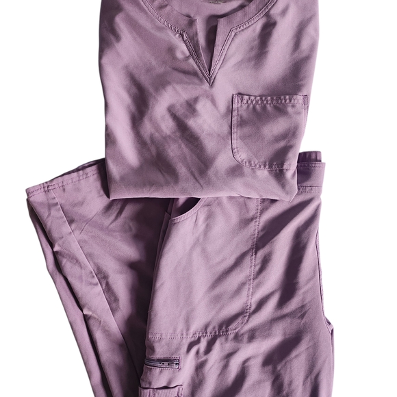 super cute lilac purple womans scrub set. brand is scrub star. purchased but dont fit, brand new. top is 3 pockets. bottoms are 6 pockets. elastic waist band. nice comfy material. both are size large