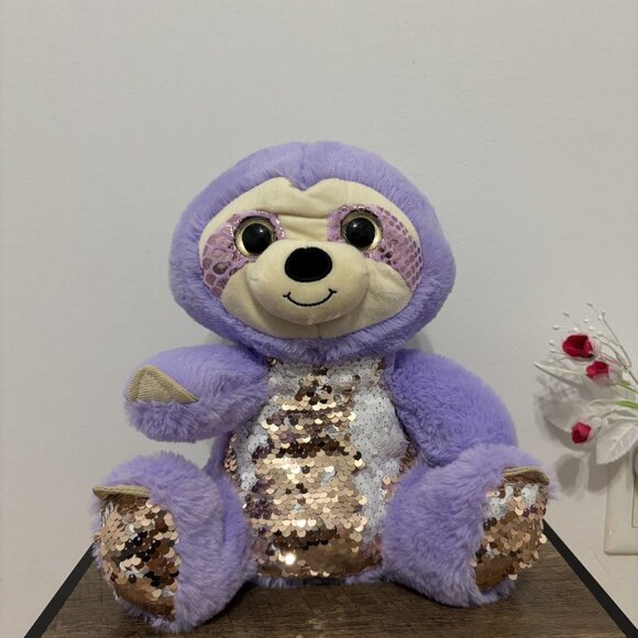 This adorable purple sloth stuffed toy is gently used but in very good condition. Its sparkly flip sequins on the tummy change color when swiped, making it a fun and magical companion!