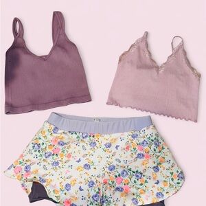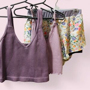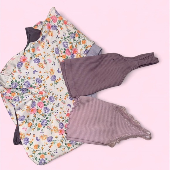 Chic floral top paired with a stylish purple lingerie set. Perfect for a cozy day in.
