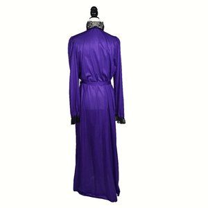 Vintage 1990s deep purple sheer nylon robe | boudoir wrapper with belt | floor length robe with black lace on both front sides and sleeves. Like New Condition this item was stored and not worn.