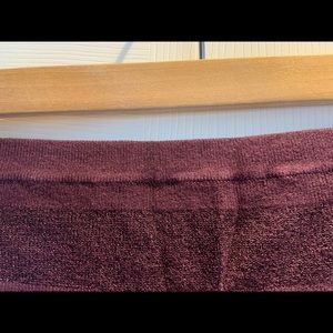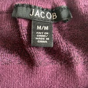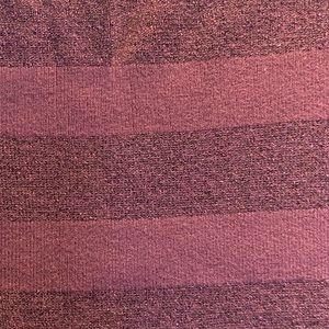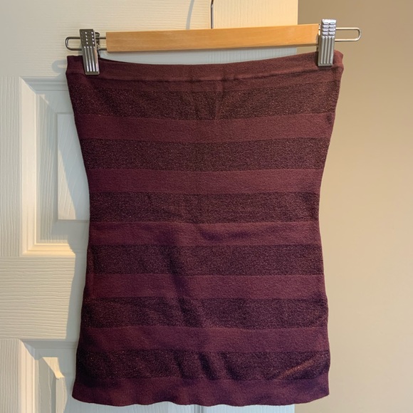 This tube top is a deep purple. It has horizontal sparkly stripes. It has an elastic at the top, and it is tight fitted when worn. Looks very pretty with black pants for a night out.