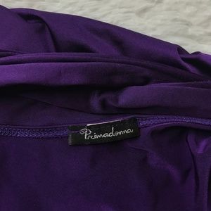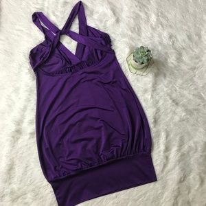 If worn as a dress it’s very mini. Would wear over leggings! Shiny purple, thinner material dress/shirt.